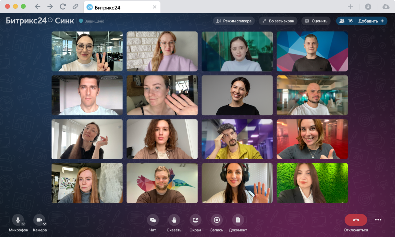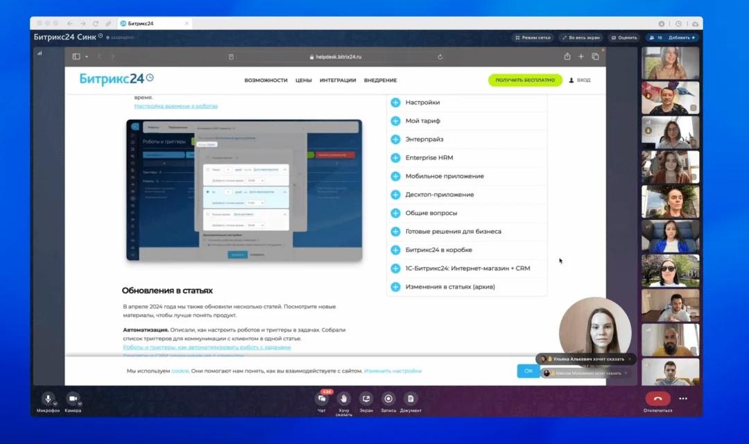 Например, в «Битрикс24 Синк» есть уникальная функция – возможность делиться экраном во время видеозвонка одновременно неограниченному количеству участников. Происходит бесшовная коммуникация внутри беседы, когда один из участников делает доклад со своей демонстрацией экрана, второй может сделать уточнение или внести правки.