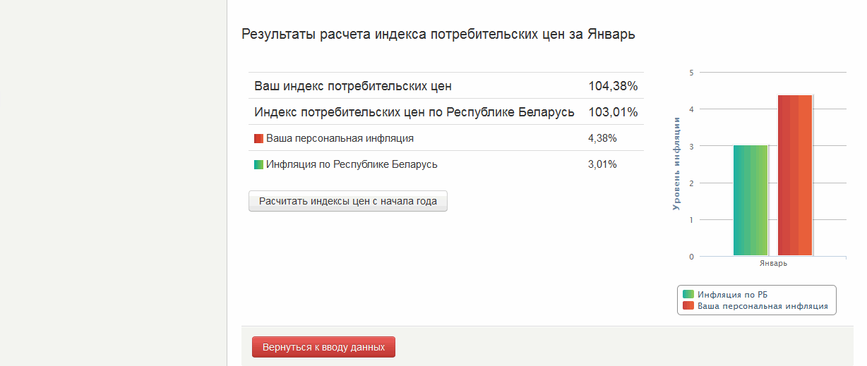 В результате произведенных расчетов, согласно введенным данным, уровень персональной инфляции за январь оказался равен 4,38% при показателе Белстата 3,01%. Индивидуальный индекс потребительских цен составил 104,38%, по республике – 103,01%.