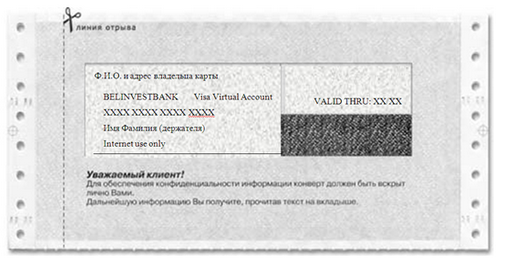 Виртуальные карты представляет собой ПИН-конверт с данными о номере карточки, сроке действия, имени и фамилии держателя, коде CVV2.