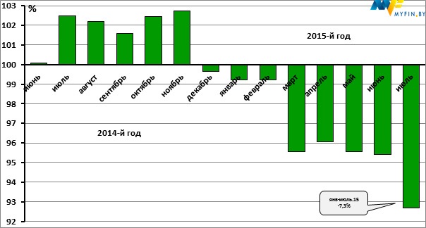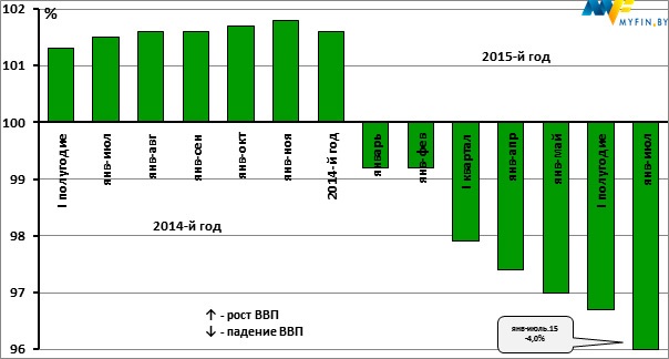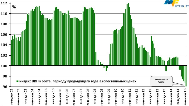 Отрицательные значения динамики ВВП (за период с начала года к соответствующему периоду прошлого года) фиксируются Белстатом уже седьмой месяц подряд. Последнее значение - минус 4,0% за отчетный период (январь-июль 2015-го к январю-июлю 2014-го - 96,0%).