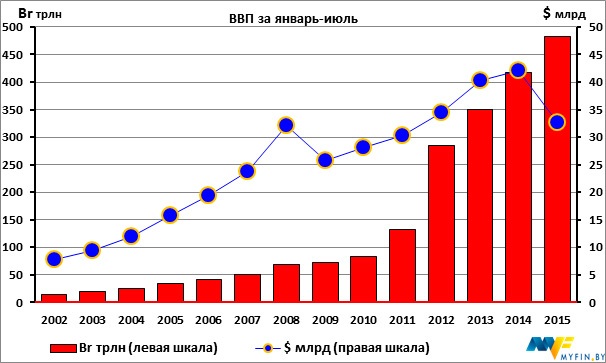 Объем произведенного ВВП за последние 12 месяцев (с августа 2014-го по июль 2015-го) - Br843,5 трлн. При прогнозных значениях от Минэкономики на 2015-й в пределах Br849,2-853,4 трлн (Постановление №8 от 23.01.15).