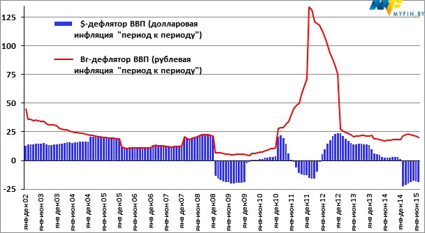 ВВП отчетного периода по сравнению с таким же 2014-го в текущих ценах больше на 15,6%, а поскольку реальный ВВП снизился, то рост этот - исключительно инфляционный. Дефлятор ВВП, показывающий инфляционное приращение номинального размера ВВП, составил, таким образом, 20,4%. Это показатель общей инфляции в Беларуси (период к периоду).