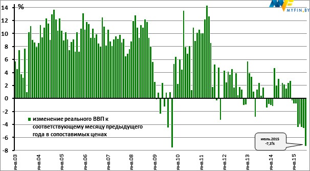 Исходя из данных Белстата по динамике ВВП за период с начала года, индекс ВВП в июле (расчетная величина) - 92,7%, то есть по сравнению с июлем 2014-го года произошло падение ВВП в реальном выражении (в ценах прошлого года) на 7,3%, когда как в последние месяцы было не более -5%. В значительной мере это объясняется большей базой (июнь 2014-го - +0,1%, июль 2014-го - уже +2,5%). Такая повышенная сравнительная база остается и на ближайшие месяцы, что не дает повода на резкий рост индекса месячного ВВП, а, значит и на основной показатель Белстата - ВВП за период с начала года.