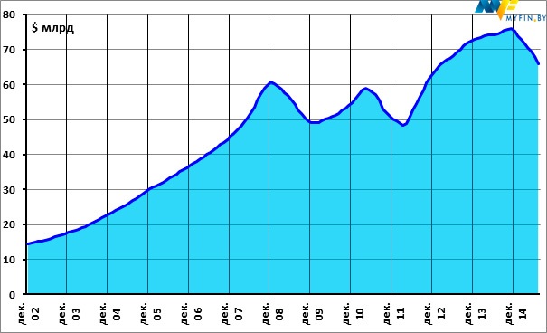 Историческим максимумом $-эквивалента 12-месячного ВВП Беларуси остается период «декабрь 2013-го - ноябрь 2014-го» (некалендарный год) - $76,1 млрд. На душу населения это было $8035. ВВП календарного 2014-го - $75,3 млрд в эквиваленте, или 7945 $/чел. Сейчас же снизился до $6950 $/чел. Прогноз - дальнейшее снижение до $60 млрд и 6300 $/чел.