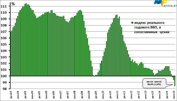 Три месяца назад динамика годового (за 12 месяцев) ВВП впервые с 90-х ушла в красную зону: первый годовой «минус» зафиксирован в мае (-0,2% за период «июнь 2014-го - май 2015-го»,  расчет исходя из официальных данных по ВВП за период с начала года). Белстат до этого ни разу за последние, как минимум, 15 лет не выставлял в своих отчетах отрицательное значение динамики годового ВВП. Через месяц «минус» вырос до -0,7%. В отчетном же месяце (за период «август 2014-го - июль 2015-го») достигнуто значение -1,6%.