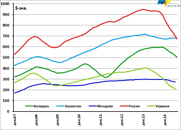 Исторический максимум долларового эквивалента средней заработной платы в России - $1205 (декабрь 2013-го), в Казахстане - $890 (тоже декабрь 2013-го), Беларусь - $629 (июль 2014-го), в Украине - $439 (декабрь 2013-го), в Молдове - $328 (также декабрь 2013-го).