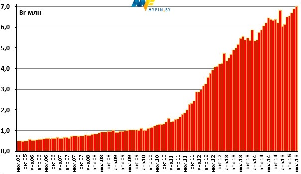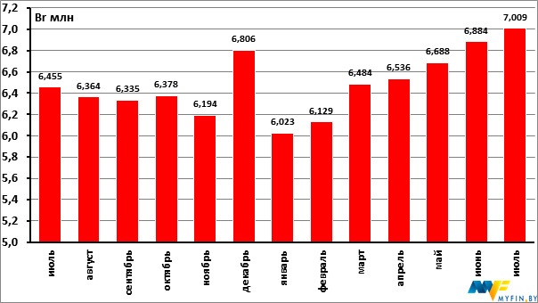 Размер средней номинальной начисленной (то есть, с включенными налогами) заработной платы в июле обновил исторический максимум белорусских зарплат в национальной валюте и составил Br7,009 млн. Это на Br125 тыс. больше, чем было в прошлом месяце (предыдущий исторический рекорд), на Br203 тыс. больше, чем в декабре 2014-го (максимум прошлого года), и на Br554 тыс. больше, чем ровно год назад, в июле 2014-го.