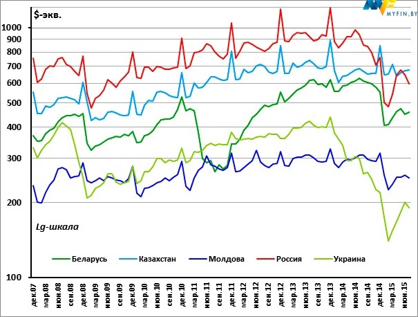 Рис.11. Динамика долларовой величины средней за 12 месяцев месячной заработной платы («скользящий год») Беларуси, Казахстана, Молдовы, России и Украины