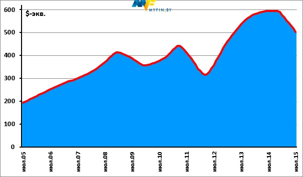 Долларовый эквивалент зарплат также подрос с прошлого месяца до $458, но ровно год назад, в июле 2014-го, зарплаты в долларах были значительно (на треть) больше, чем сейчас. И что особенно обидно, полученные в августе деньги за июль попали под каток девальвации, если только они не были потрачены сразу. Августовская же зарплата уже значительно потеряет в долларовом весе, хорошо хоть ниже $400 не упадет.