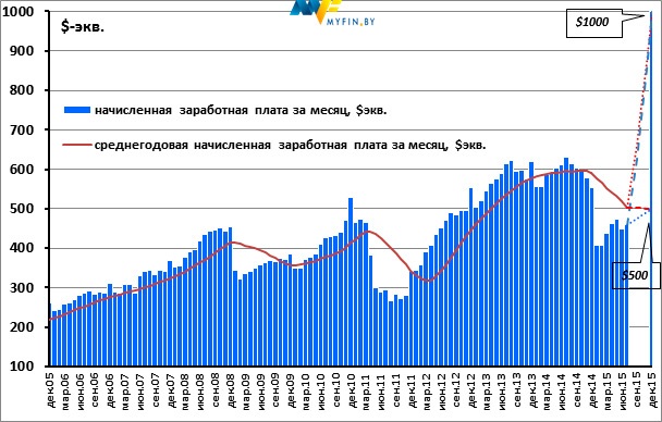 И теперь в текущем 2015-ом году перед властями снова встает главная задача года 2010-го - как довести среднюю зарплату до $500. Причем даже не среднегодовую (что уже не реально), а хотя бы декабрьскую в самый «зарплатный» месяц. Об обещаниях приблизить к концу 2015-го зарплату к $1000-й отметке уже и не вспоминаются.