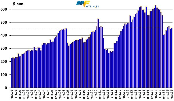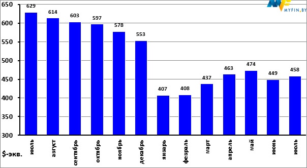 Средневзвешенный курс белорусского рубля к доллару по данным Национального Банка вырос до 15291 Br/$ в июле с июньских 15317 Br/$, то есть Br-рубль немного укрепился, что добавило лишний доллар в зарплатный $-эквивалент. Всего же долларовый эквивалент средней начисленной заработной платы в отчетном июле вырос с предыдущего месяца на $9 и составил $458. Историческим максимумом остается $-эквивалент средней зарплаты июля прошлого года - $629.