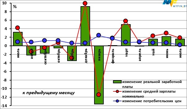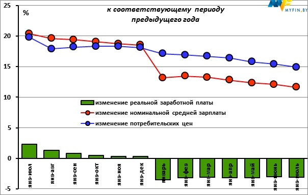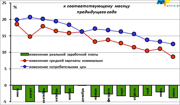 По сравнению с средней зарплатой июля прошлого года, средняя зарплата июля года текущего номинально больше на 8,6%. Потребительские же цены за прошедшие 12 месяцев выросли, как считает Белстат, на 12,5%. Исходя из этого, в июле 2015-го средняя по стране зарплата в реальном выражении оказалась, меньше, чем в июле 2014-го, на 3,8%.