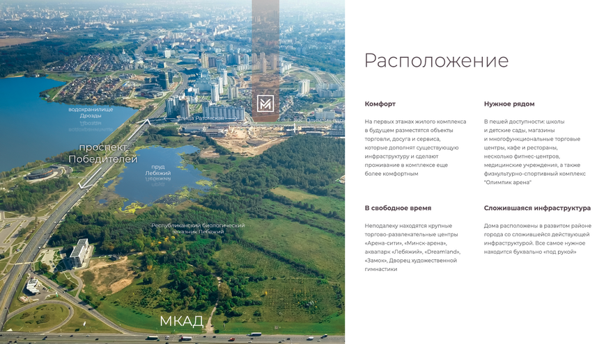 Расположение в одной из самых экологически чистых и перспективных частей города – микрорайоне Лебяжий – главное преимущество 6-ти этажного дома клубного типа. «Монтерей» особенно подойдет для тех, кто хочет ежедневно наслаждаться чистым воздухом, сохраняя при этом все возможности, предоставляемые мегаполисом. В шаговой доступности здесь школы и детские сады, магазины и торговые центры, кафе и рестораны, а также физкультурно-спортивный комплекс «Олимпик Арена».
