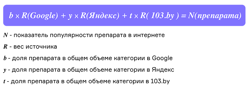 Методология исследования AMDG включает в себя анализ спроса на лекарственные препараты в разрезе трех систем: Google, Яндекса и 103.by. Частота запросов показывает, насколько популярен препарат в поисковой системе, то есть сколько пользователей искали этот препарат.