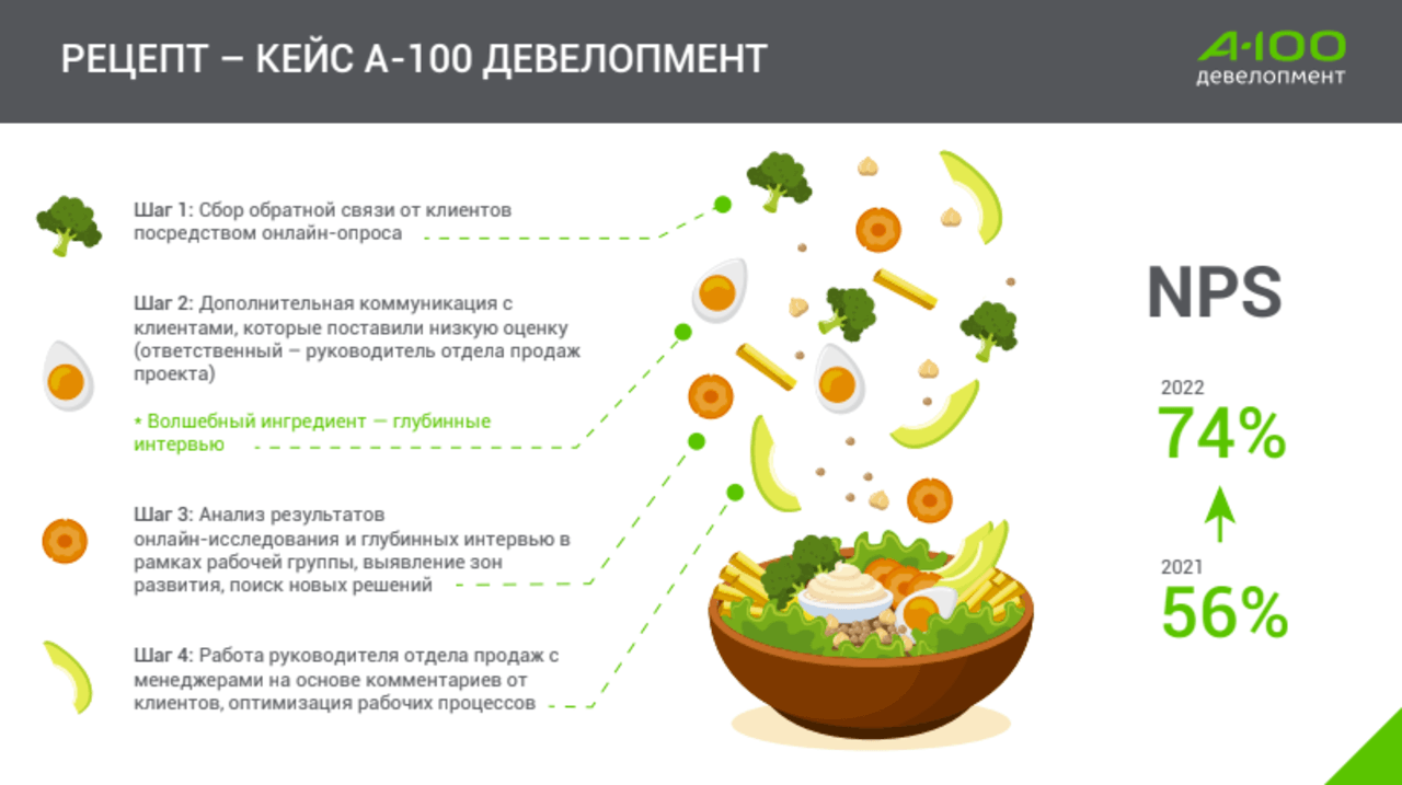 Мы пошли дальше в том, что стали проводить глубинные интервью с теми, кто поставил низкую оценку. Это входит в ежемесячную работу с результатами NPS в офисах продаж. На рисунке представлен его «рецепт». Его волшебным ингредиентом является дополнительная коммуникация руководителей продаж с клиентами, которые поставили низкую оценку.