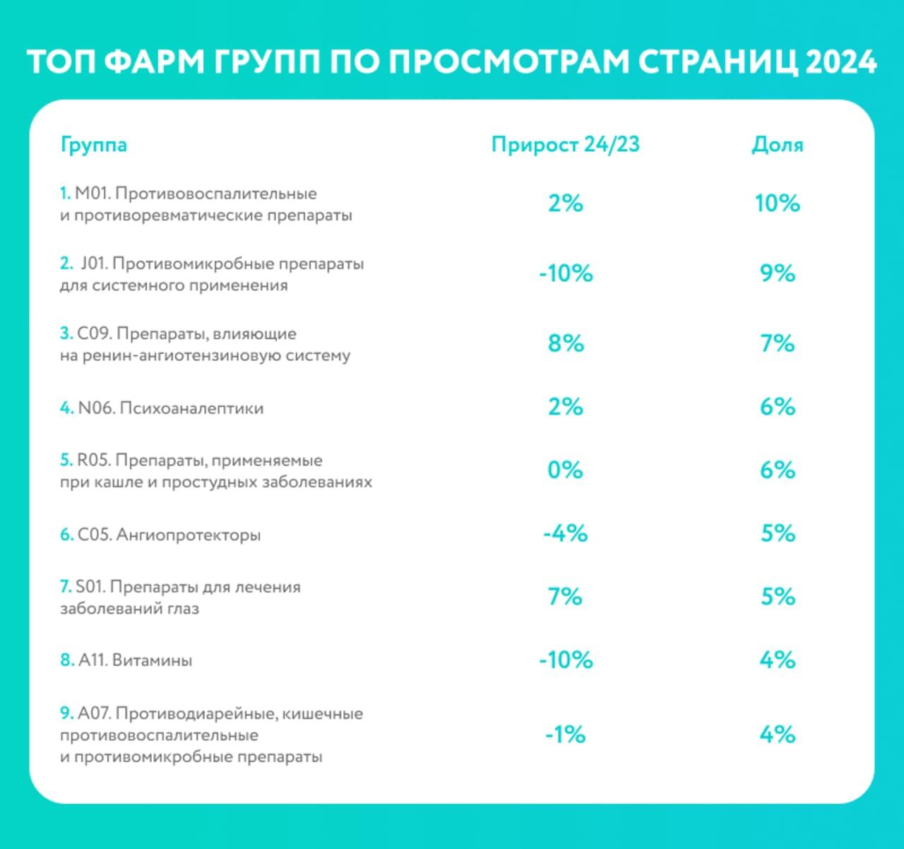 Анализ интереса к страницам препаратов показывает, какие группы пользователи изучают чаще всего. Препараты от давления, антибактериальные средства и психоаналептики лидируют по количеству просмотров. Обращает на себя внимание рост интереса к препаратам С09 на 8% по сравнению с прошлым годом.