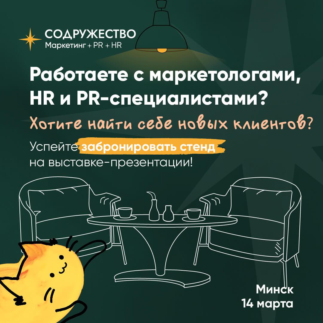 А если вам самим есть, что сказать маркетологам PR и HR всей Беларуси, у вас есть кейсы, которыми хочется делиться - присоединяйтесь к команде Партнеров Содружества! Вы еще можете успеть забронировать себе стенд на выставке! Осталось всего 5 мест!