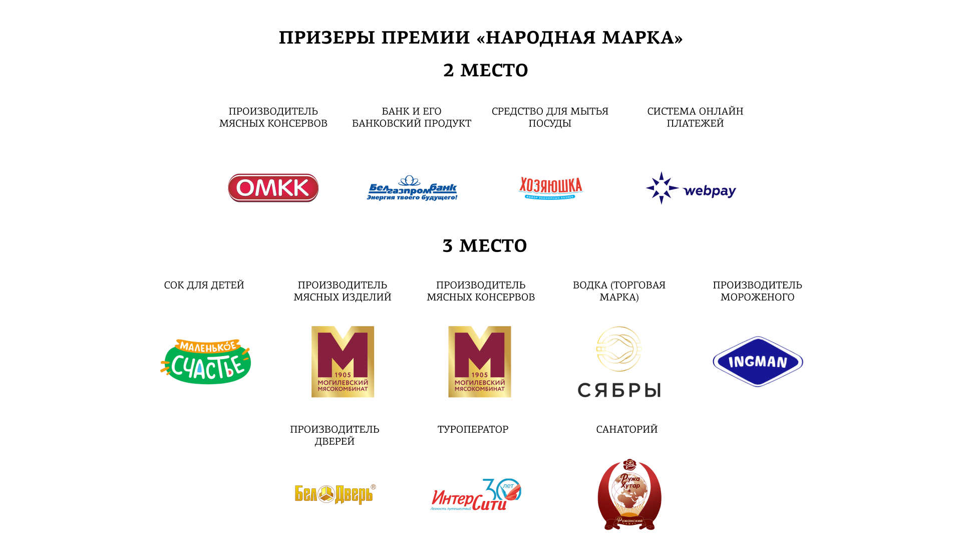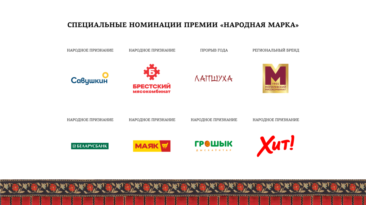 Из года в год уровень брендового сознания белорусских потребителей растет: в течение многих лет по признанию потребителей в большинстве номинаций Премии «Народная Марка» лидируют товары и услуги, произведенные в Беларуси. Покупатели с радостью отдавали свои голоса в поддержку отечественных производителей, тем самым демонстрируя доверие и любовь к их продукции, и этот год не исключение.