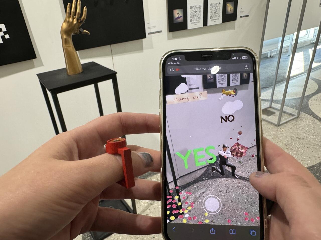 Инсталляция с кольцами, которые оснащены чипами NFC, переносит в виртуальный мир, отображающийся на экране телефона. Авторы предлагают романтическую опцию. Таким образом, можно сделать предложение своей спутнице. Свадебную церемонию также могут провести в виртуальном пространстве. Для этого гостям и молодоженам необходимо взять в аренду VR очки. Авторами разработки стало объединение художников VRiDEj.