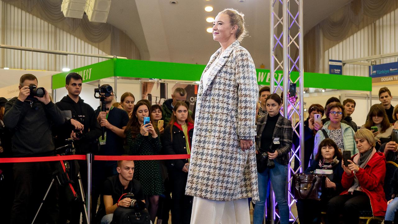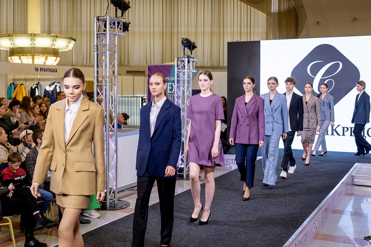 По центру выставочного зала проходил показ новых коллекций белорусских производителей. Преимущественно можно было наблюдать за новинками школьной моды и детскими костюмами, но для женщин также нашлось несколько интересных моделей на сезон осень–зима 22/23.