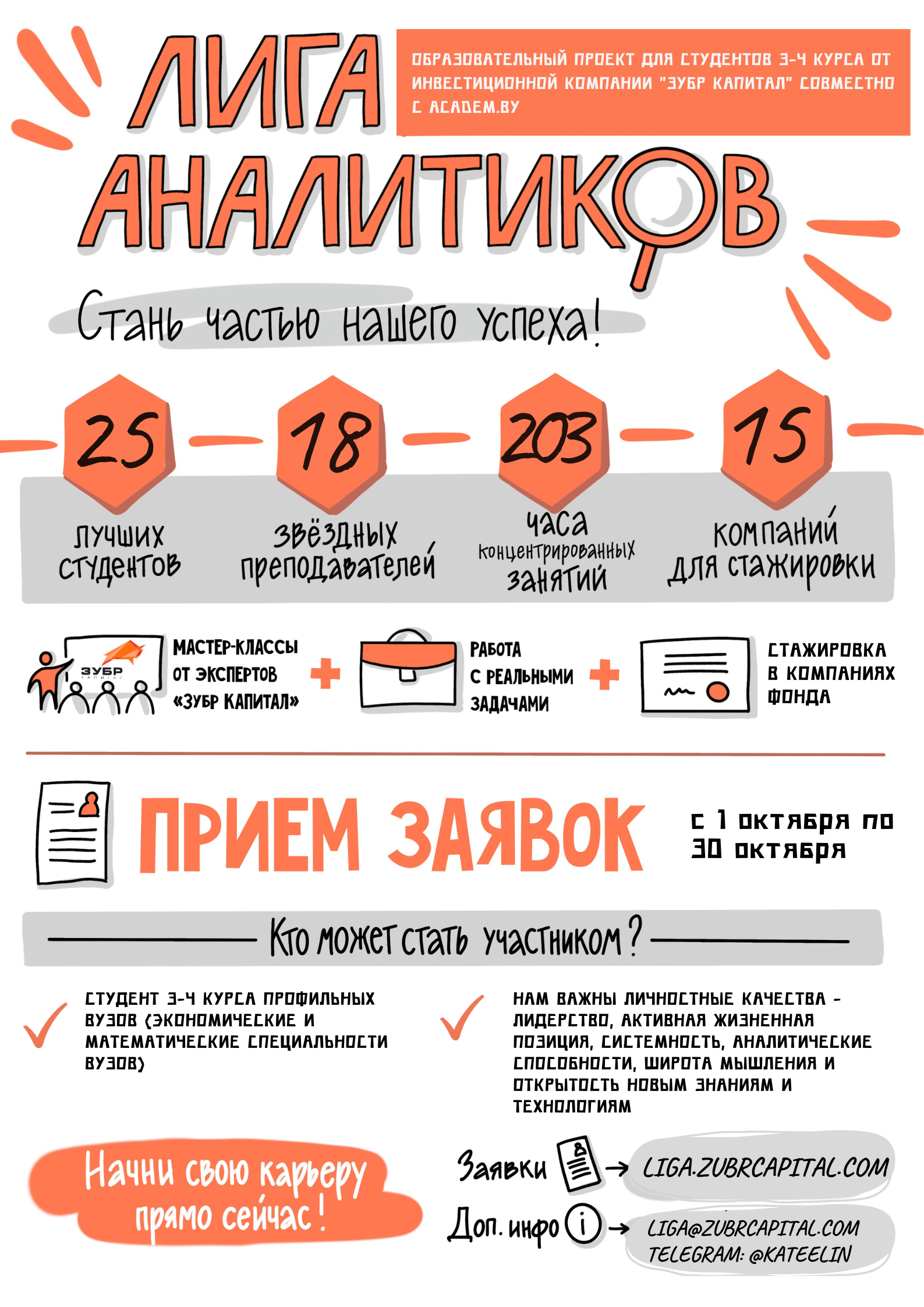 Инвестиционная компания «Зубр Капитал» в партнерстве с Academ.by продолжает образовательный проект для студентов «Лига аналитиков 3.0». Цель образовательной программы – подготовить студентов профильных специальностей к работе инвестиционного или финансового аналитика.