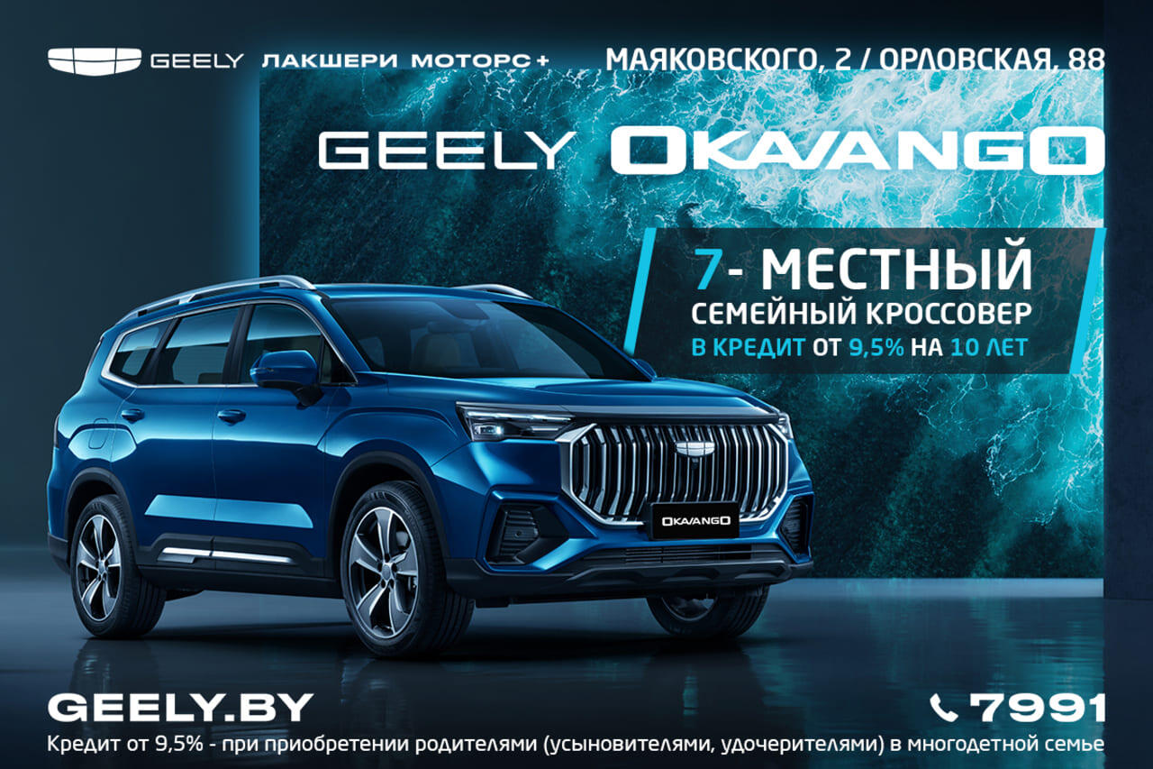 За 102 000 BYN в Лакшери Моторс Плюс можно приобрести семиместный кросс-вэн Geely Okavango, предлагающий просторный салон, 200-сильный бензиновый турбомотор и передовые технологии для комфортных поездок большой компанией на дальние расстояния.