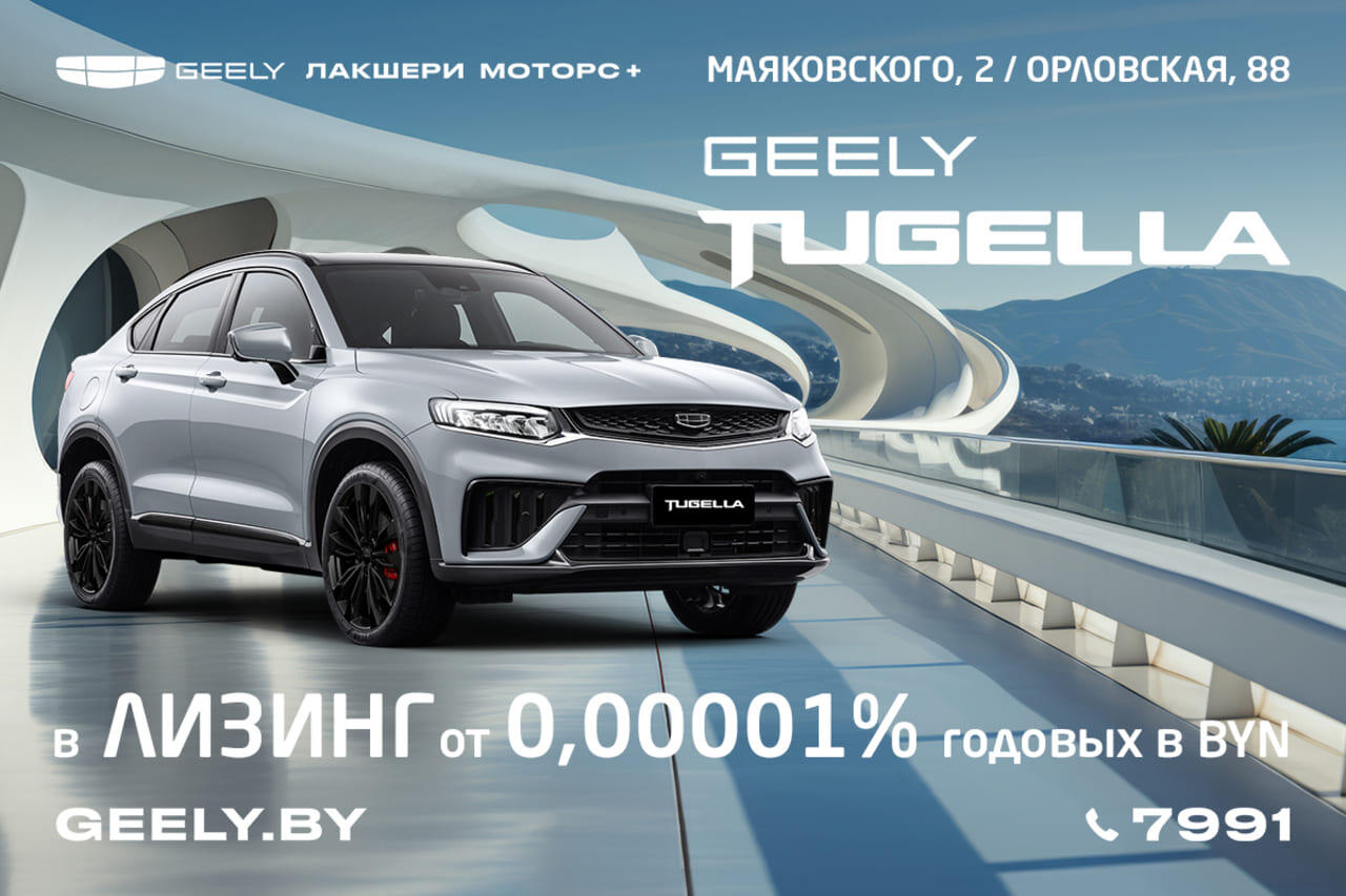 Купе-кроссовер Geely Tugella с полным приводом, спортивным дизайном, мощным двигателем и премиальным оснащением можно приобрести на Маяковского, 2, и Орловской, 88, по ценам 111 600 BYN и 126 800 BYN.