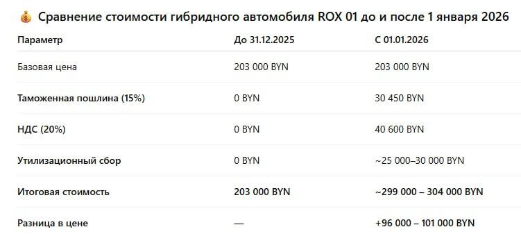 В Беларуси цены на гибридные автомобили с 2026 года вырастет на 20-30%. Повышение коснется как новых партий, так и ранее ввезенных иномарок. Прогнозом с MYFIN поделилась компания «АВТОВЕЛЬТ», официальный дилер ROX и AVATR.