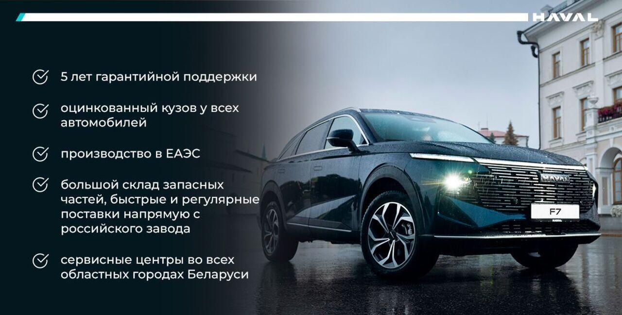 Автомобили HAVAL производятся в ЕАЭС и адаптированы для местных условий эксплуатации. Комфортное владение автомобилем HAVAL обеспечат сеть сервисных центров по всей стране и наличие больших складов запчастей в Минске.