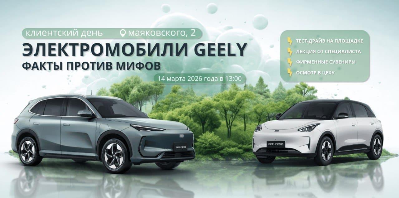 Итак, уже 14 марта в 13:00 в автоцентре Geely “Лакшери Моторс плюс” на Маяковского, 2 гостей ждет интерактивная лекция на тему “Электромобили Geely: факты против мифов от эксперта”, увлекательные активности с фирменными сувенирами, разбор электромобилей в сервисном цеху, тест-драйвы на площадке дилера: все, чтобы ваш выходной прошел познавательно, весело и по-весеннему тепло.