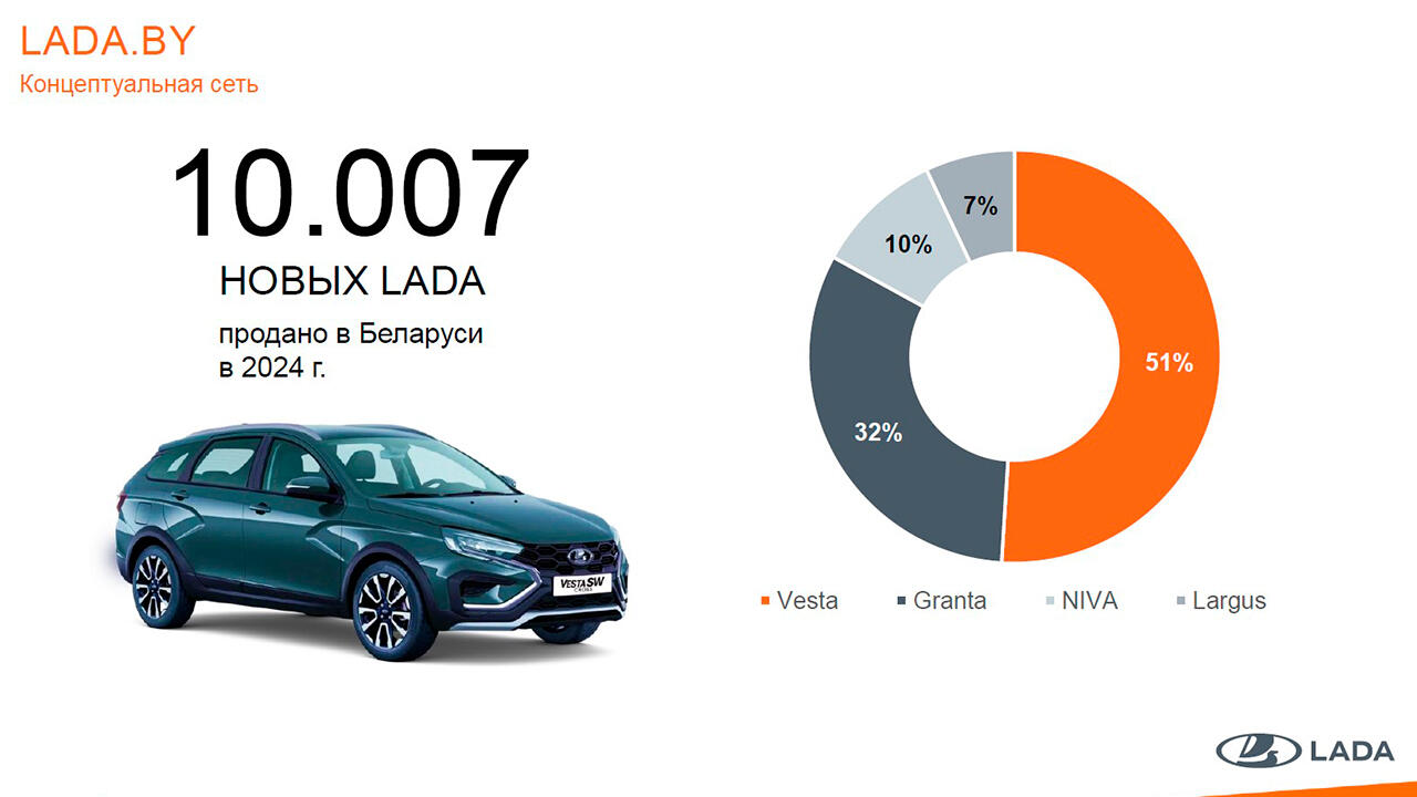 Всего в существующих 12 дилерских центрах концептуальной сети LADA.BY за 2024 год было продано 10 007 автомобилей российского бренда. По данным, озвученным представителем дилерской сети, лидером продаж в 2024 году стали автомобили семейства Lada Vesta, которые составили больше половины от всех проданных авто бренда – 51 %. Второй по популярности у белорусов стала Lada Granta (32 %). У «Нивы» (включая классическую Lada Niva Legend и обновленную Lada Niva Travel), – 10 %, у Lada Largus – 7 % от объема продаж.
