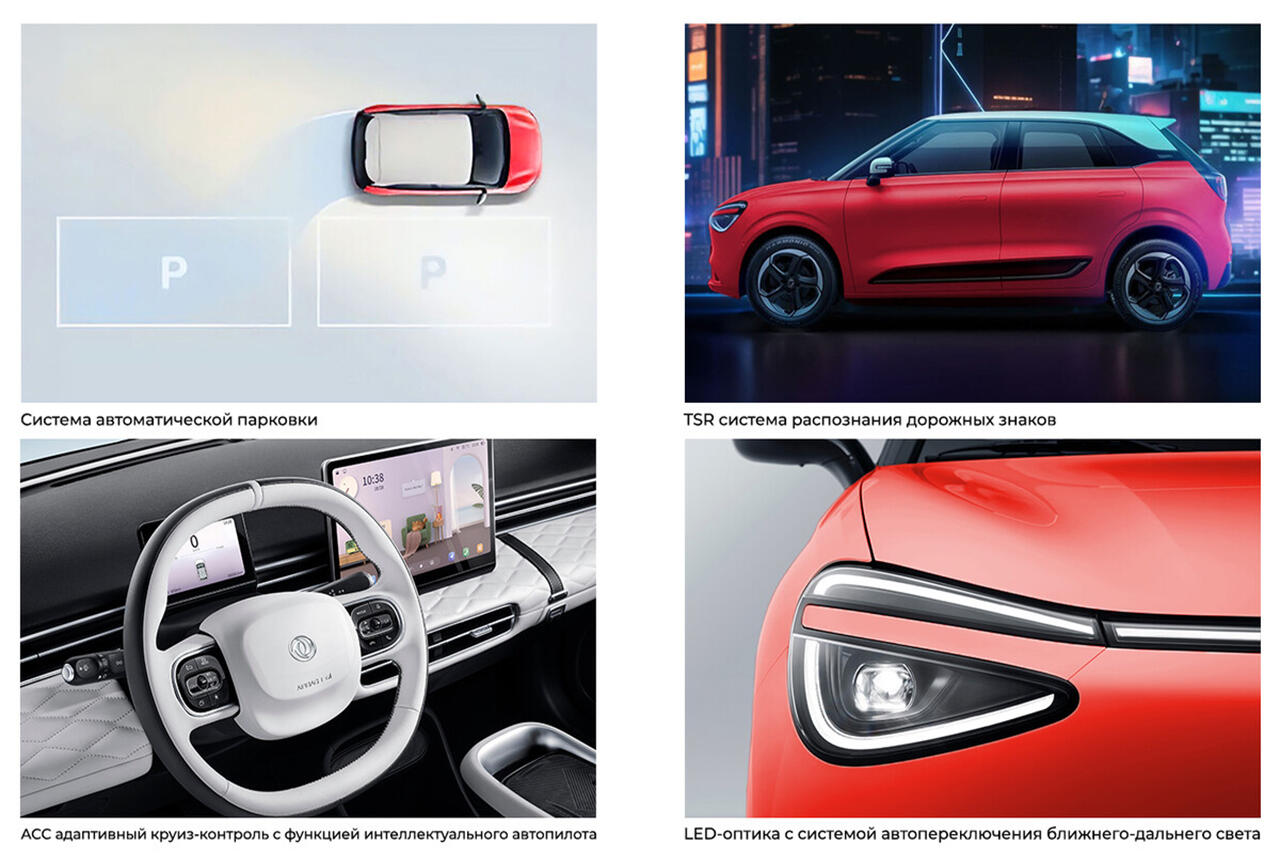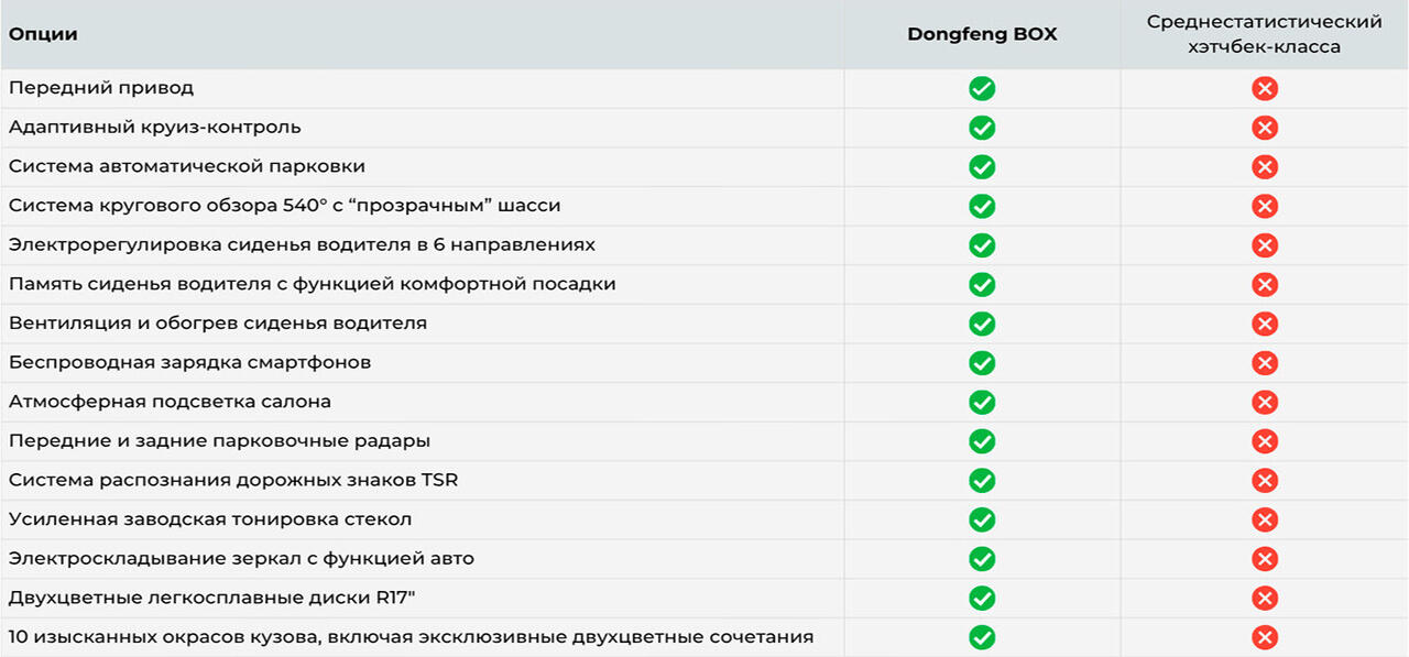 Переднеприводный дизайнерский хетчбэк Dongfeng BOX с премиальными опциями включает: автопилот второго уровня (адаптивный «круиз» + активные ассистенты), систему кругового обзора AVM 540° с функцией прозрачного шасси, автоматическую парковку, электропривод сиденья водителя с памятью, обогревом и вентиляцией, заводскую тонировку, двухцветные легкосплавные диски 17″ и десять изысканных окрасов кузова. А батарея на 43,89 кВтч обеспечивает запас хода 430 км (CLTC) – и это при доступной цене!