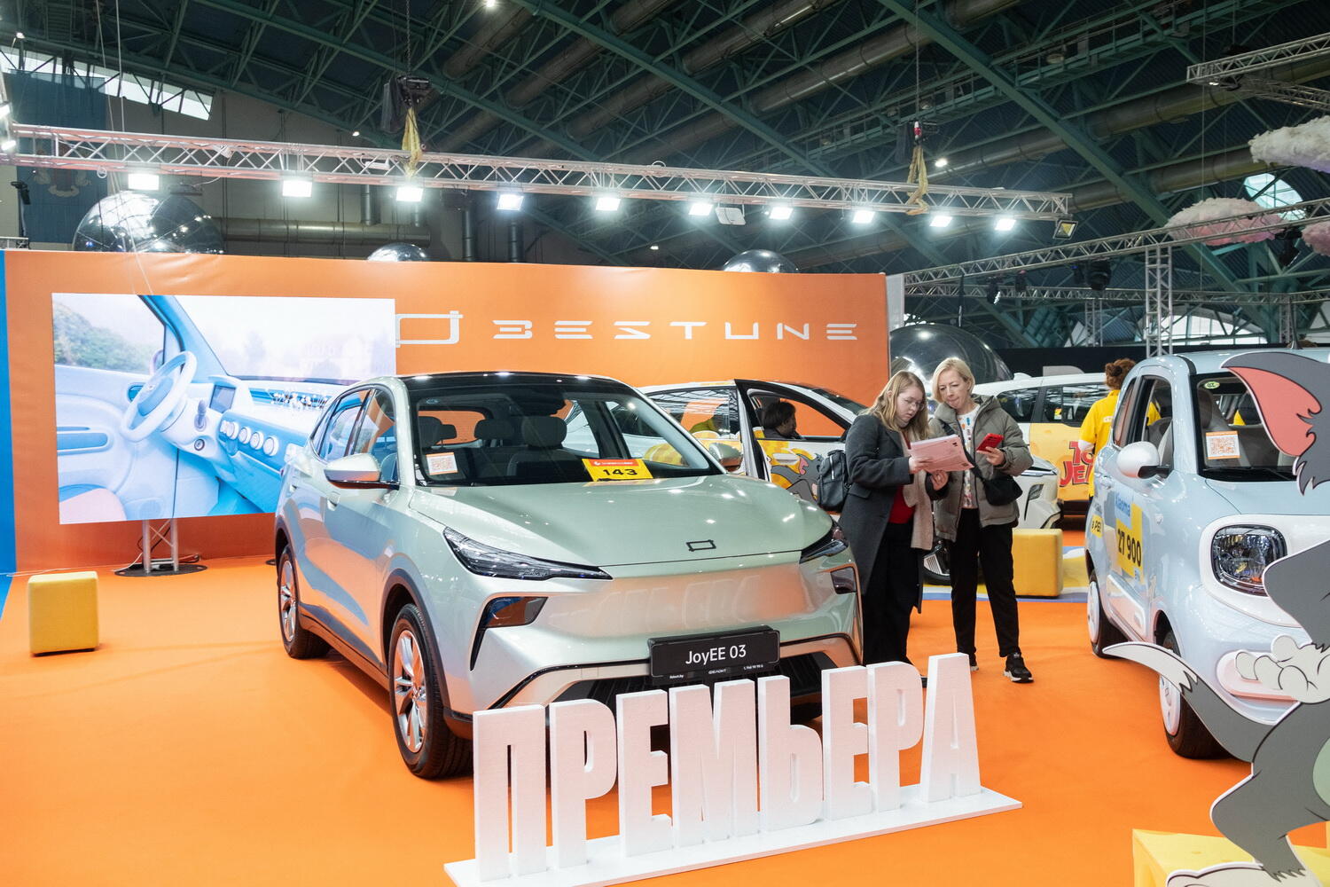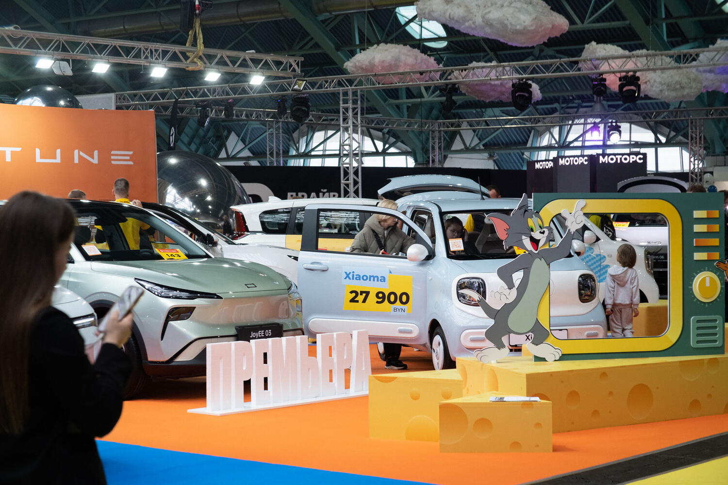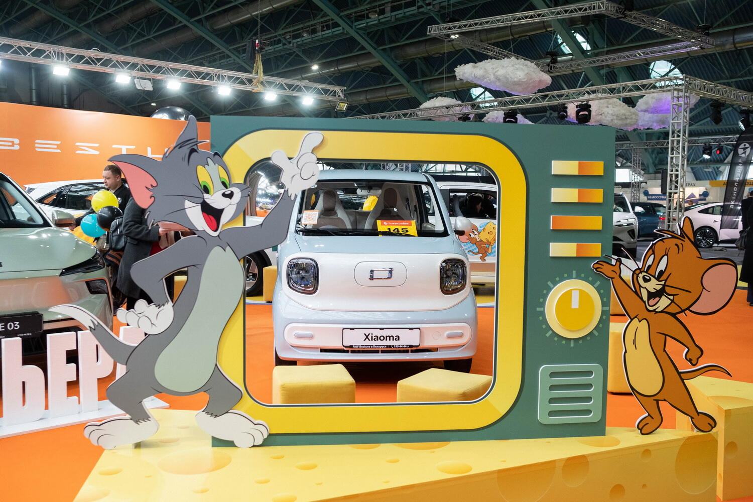 Две новые модели показал дилер бренда FAW – Xiaoma (Pony) и JoyEE 03. Обе электрические. Если первая – это чисто городской микромобиль, то то вторая – полноценный конкурент городским кроссоверам: до 565 км хода, интересный дизайн, адаптация под наши дороги. Обе машины, оформленные в мультяшной стилистике «Том и Джери», привлекли внимание не только любопытных, но и потенциальных покупателей.
