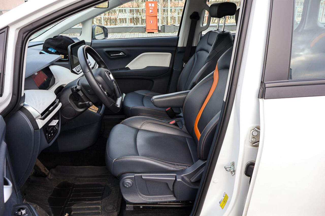 Водители очень довольны передними креслами. Во-первых, они удобные, во-вторых, есть подлокотник – не надо думать, куда девать правую руку, не занятую переключением передач. В-третьих, наличие обдува – летом топ-опция. А зимой классно, что в электромобиле салон начинает прогреваться сразу после запуска, а не спустя время, требуемое на прогрев двигателя.
