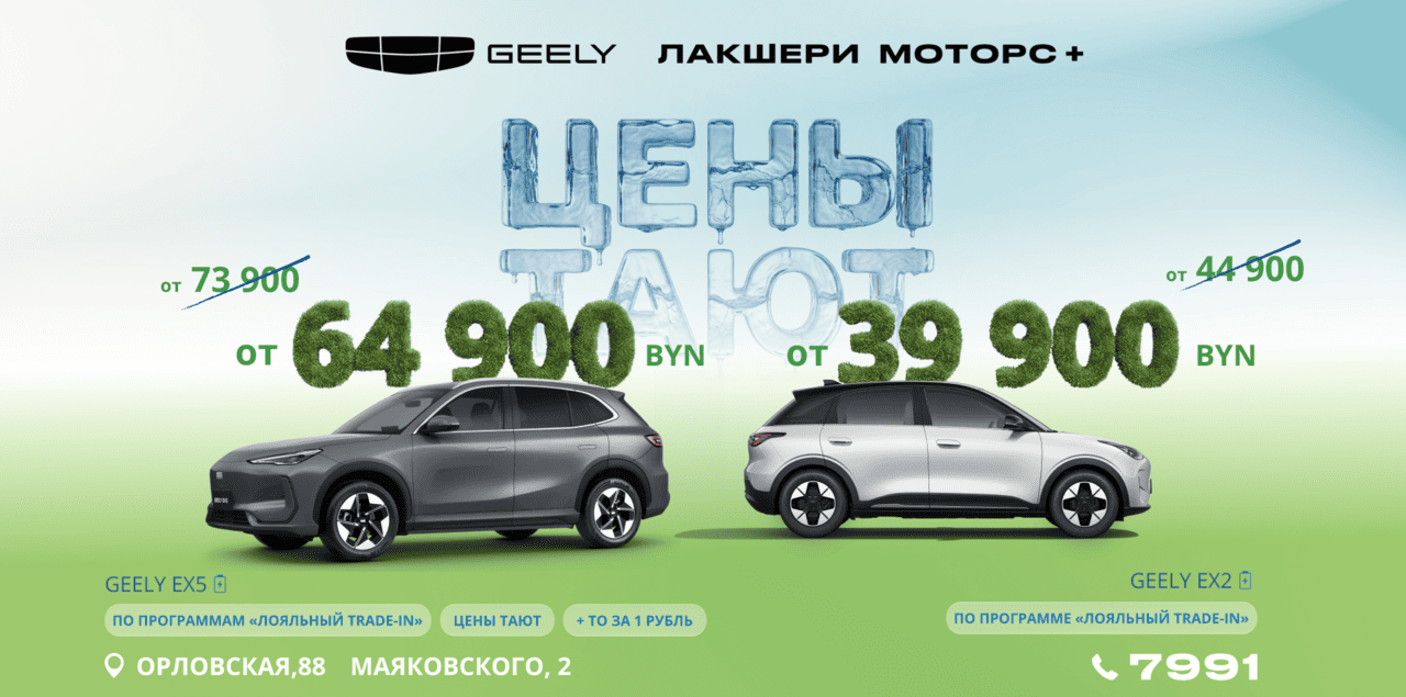 - Участники программы Trade-In и покупатели Geely EX5 получают выгоду до 5000 BYN и проведение ТО1 за 1 белорусский рубль (на Geely EX2 не распространяется)!