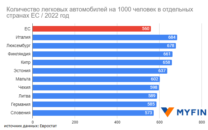 По информации ведомства, в среднем в 2022 году на 1000 жителей в Евросоюзе приходилось 560 легковых автомобилей.
