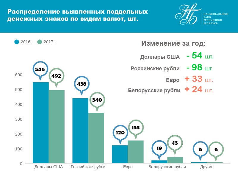 Было установлено, что 85% поддельных банкнот долларов США и 76% поддельных банкнот евро изготовлены с использованием полиграфических технологий. «Для воспроизведения изображений остальных поддельных долларов США и евро, а также поддельных белорусских и российских рублей были использованы технологии репрографии – принтерные устройства (струйная печать и электрофотография)», – отмечается в сообщении регулятора.