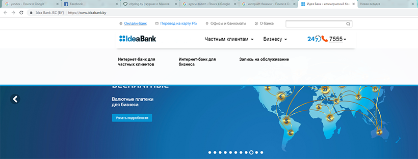 По главной странице сайта сразу видно, что банк заинтересован в онлайн-клиентах. Сверху голубым выделен «Онлайн-банк» – это как раз то, что мне нужно. Полагаю, что мне нужен Интернет-банк для частных клиентов.