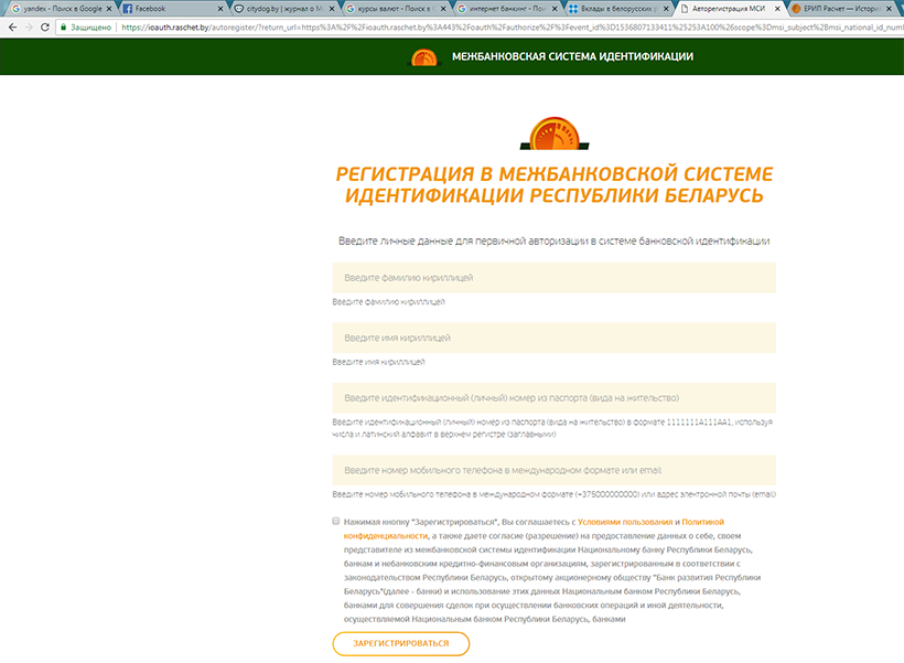Соглашаюсь с «Условиями использования» и «Политикой конфиденциальности» и кликаю «Зарегистрироваться». На мой мобильный приходит СМС от raschet.by с временным паролем – и вот я в системе. Оказывается, она в курсе моего места регистрации, а также моих предыдущих взаимодействий с белорусскими банками.