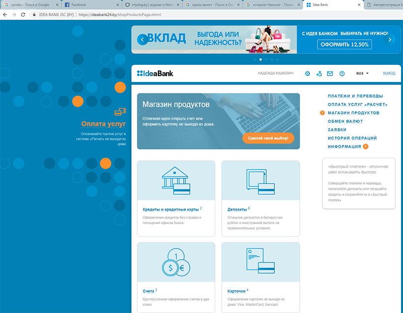Возвращаюсь на страницу «Онлайн-банк», кликаю на вход по МСИ, ввожу свои данные – и вот я в онлайн-банке Идея Банка. Все оказалось довольно просто! Тем более есть интуитивная система подсказок для клиентов.