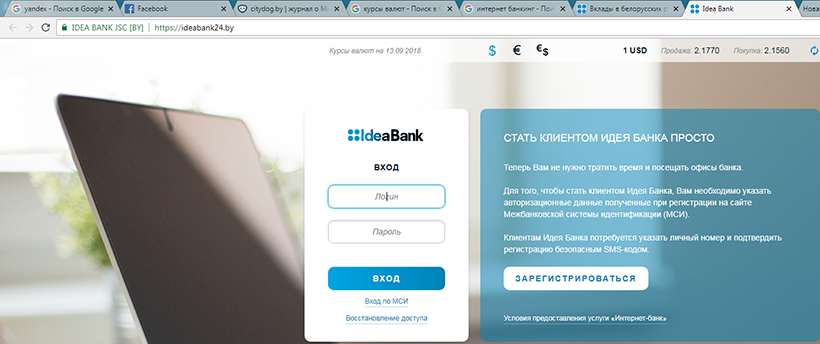 Кликаю на него. Так, а вот тут, возможно, и зарыта собака. У меня просят логин и пароль. В качестве альтернативы предлагают вход по МСИ (честно, не очень понимаю, что это такое, но такую аббревиатуру где-то встречала) или зарегистрироваться в качестве клиента Идея Банка. Пока я не являюсь таковым. Мне не очень понятно, что делать дальше. Может, закрыть все и просто как-нибудь на досуге сходить в ближайший банк? Но решаю пока не сдаваться и кликаю на «Вход по МСИ».