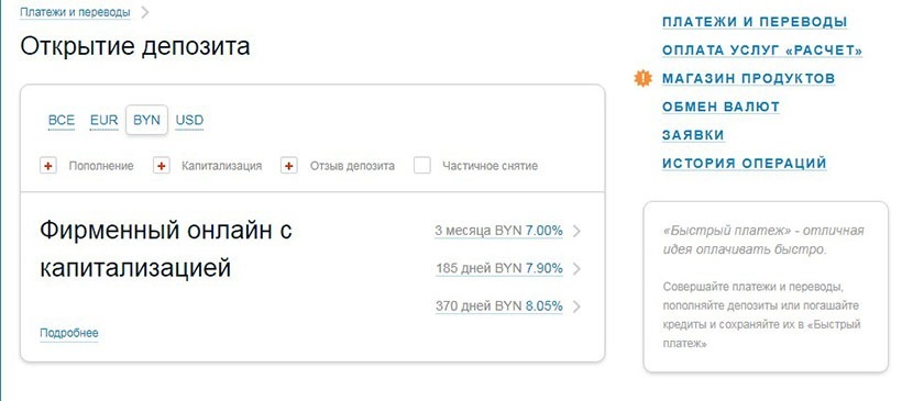Меня интересует раздел «Депозиты», кликаю на него. Как и в «Калькуляторе вкладов» на сайте, выбираю свои параметры. Меня интересует вклад в белорусских рублях с возможностью пополнения, капитализации и – обязательно – отзыва.