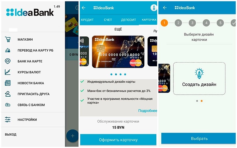 Интуитивное меню в левом верхнем углу позволяет в разделе «Магазин» оформить в несколько кликов кредит, открыть депозит или счет в Идея Банке, а также оставить заявку на приобретение карточных продуктов. Это нам и нужно. На заветной страничке - карта «Ещё». Выпуск карты «Ещё» бесплатный. Однако обслуживание стоит 15 BYN в год, т.е. в месяц карта мне будет обходиться в 1,25 рублей. Думаю, что полученный в процессе пользования картой мани-бэк вполне оправдает данные расходы.