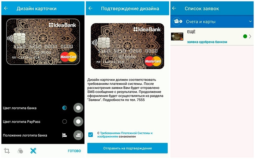 После выбора и загрузки дизайна карты на мобильный телефон пришло СМС-сообщение от 7555 об одобрении индивидуального дизайн карты «Ещё». Теперь в Мобильном приложении в «Списке заявок» карте буквальном смысле горит зеленый свет!