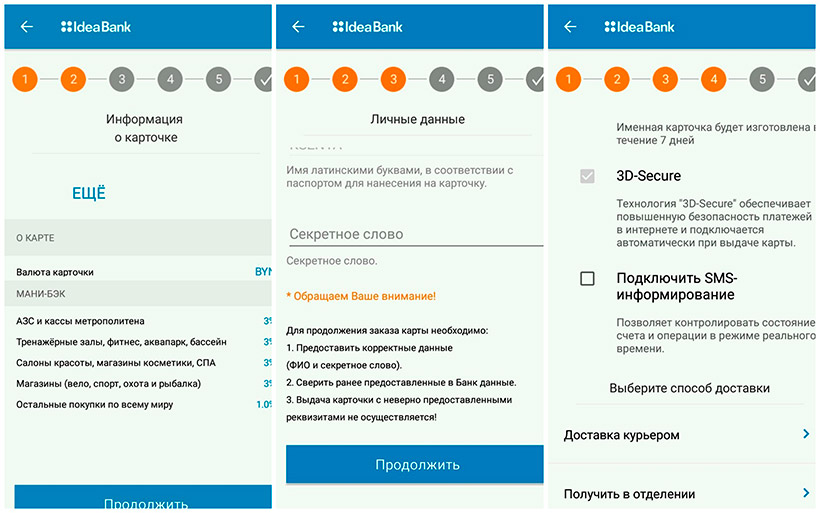 И переходим к шагу 5, где, помимо дополнительных услуг, оказываемых банком (оформление Именной карты, 3D-Secure и SMS-информирование), можно выбрать удобный способ доставки: курьером или получение в отделении.