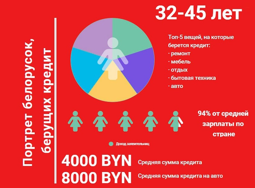 Средняя сумма кредита, которую белоруски берут на потребительские нужды, находится в пределах 3000-5000 рублей, а средний срок кредита 3-5 лет. При этом по категории автомобили средняя сумма кредита составляет 8000 рублей.