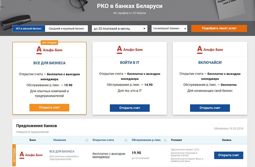 При помощи нашего подборщика можно сузить круг оптимальных предложений: в зависимости от количества совершаемых платежей в месяц, наличия мобильного и интернет-банкинга, необходимости выезда специалиста, платежей в валюте и пр. Нажимаем «Подобрать расчетный счет» и смотрим варианты.