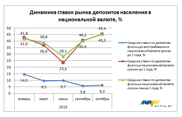 Краеугольным камнем рынка банковских депозитов был и остается отток национальной валюты со сберегательных и текущих счетов. Ставки по срочным вкладам населения по итогам октября обновили годовой максимум и достигли отметки 45,4% годовых – по вкладам на срок свыше 1 года и 45,3% годовых – по вкладам на срок менее 1 года.
