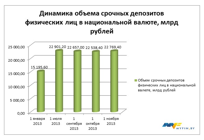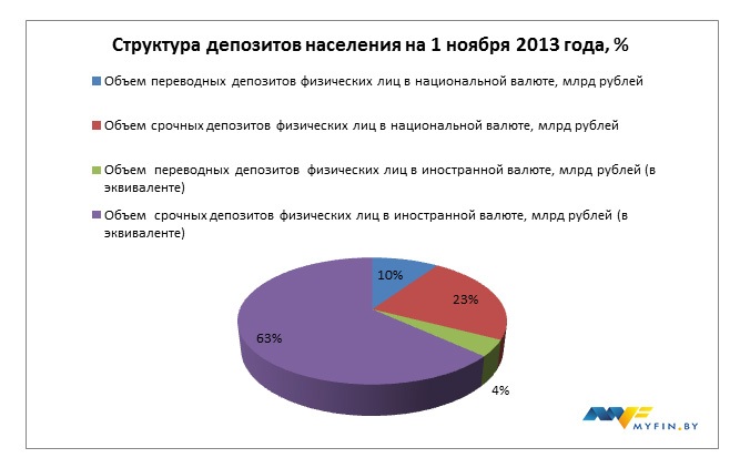 Алгоритм прост: получил зарплату, снял с карты, купил валюту, а валюту под «матрас» или на худой конец в банк. Данный тезис подкрепим положительной динамикой инвалютных вкладов физических лиц. Стабильный ежемесячный прирост депозитов данной категории составляет около 2 млрд рублей в эквиваленте. На 1 ноября 2013 года объем срочных вкладов в иностранной валюте достиг 62 636,5 млрд рублей в эквиваленте, увеличившись за минувший месяц на 2 227,1 млрд рублей.