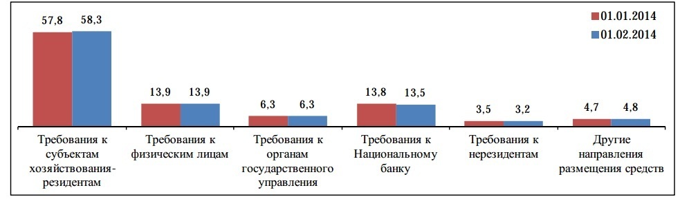 При этом по состоянию на 1 февраля 2014 года 58,3% активов банков приходятся на долю требований к субъектам хозяйствования – резидентам Республики Беларусь. 13,9% активов приходятся на кредиты физическим лицам – это более чем в 4 раза меньше требований к корпоративным клиентам банков. 6,3% активов составили требования к органам государственного управления, 13,5% - требования к Национальному банку. Нерезидентам досталось всего 3,2% совокупных активов банков Беларуси.